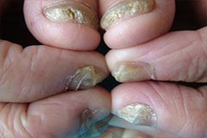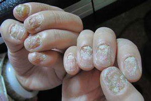 2、甲板变脆易碎:真菌侵入甲板和甲床,在角质溶解酶的作用下,角质蛋白被溶解,形成角质细小颗粒,角质颗粒呈粉末状易于脱落、松散而变得碎杂,被破坏的甲板缺乏弹性和韧性而变脆。