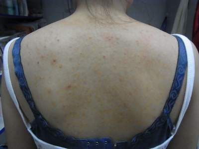 毛囊炎初起为红色充实性丘疹,皮疹数目多,但不融合,以后迅速发展成丘疹性脓疮。基本损害呈与毛囊一致的红色丘疹,其中心有毛发贯穿,顶端迅速化脓形成脓点,周围绕以红晕。以后排出少量脓液,继而干燥、结痂,痂脱不留痕迹。自觉瘙痒或轻度疼痛。