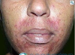 激索依赖性皮炎亦称酒渣样皮炎,或部分口周皮炎亦包含在内。是由于皮质类固醇激索使用不当或滥用造成的,临床以皮肤弥漫性红斑、毛细血管扩张、针尖样脓疱、皲裂、脱屑、色索异常为特征。多见于长期外用皮质类固醇激素之人。多发半个月以上皮质类固醇激素用药史,并形成依赖。患处皮肤弥漫性红斑,不同程度表皮变薄发亮,毛细血管扩张。脱屑,皮肤异色,萎缩瘢痕,红疙瘩等。