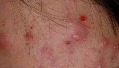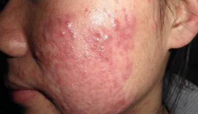 脓疮性青春痘:皮肤上,以脓疮表现为主,绿豆大小,顶部形成白头脓疱,底部颜色为浅红或深红,触碰时感觉疼痛,脓液较为黏稠,治疗不当,常遗留或浅或深的瘢痕。
