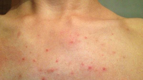 湿疹:湿疹是一种常见的表皮及真皮浅层炎症性皮肤病。在临床上有多种表现,在病程发展中红点、红斑、丘疹、水疱、脓疱、糜烂、结痂等各型皮疹症状可循序出现。湿疹症状出现初期,皮肤浸润增厚,逐步变成暗红色及色素沉着;湿疹持久不愈时,皮损纹变粗大,表现干燥而易发生皲裂,常见于手足、胸部、小腿、肘窝等处。