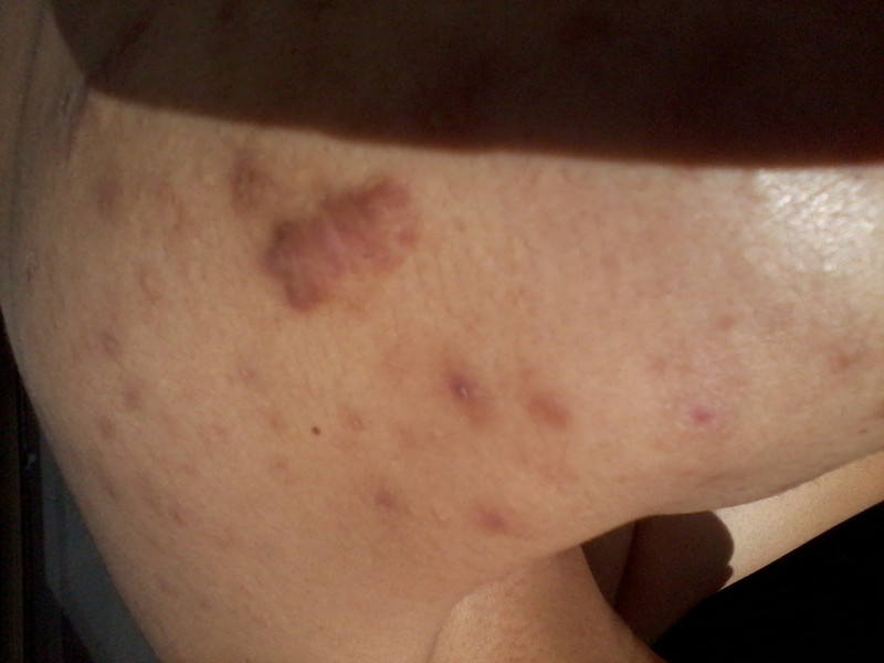 1、湿疹:湿疹是一种常见的表皮及真皮浅层炎症性皮肤病。在临床上有多种表现,在病程发展中红点、红斑、丘疹、水疱、脓疱、糜烂、结痂等各型皮疹症状可循序出现。湿疹症状出现初期,皮肤浸润增厚,逐步变成暗红色及色素沉着;湿疹持久不愈时,皮损纹变粗大,表现干燥而易发生皲裂,常见于手足、胸部、小腿、肘窝等处。