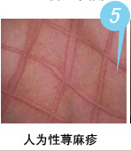 人工性荨麻疹:用指甲或钝器划皮肤时,即发生与划痕相一致的条状隆起,不久消退,伴有瘙痒。