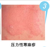 压力性荨麻疹:主要表现为皮肤受压后出现真皮及皮下组织弥漫性水肿及斑块、境界不清、常累及行走、站立后的足底、久坐后的臀部、提重物或穿紧身衣等受压处,有自觉瘙痒感、紧绷感、灼痛感或灼热感,可出现流感样症状。