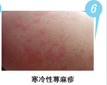 寒冷性荨麻疹:主要表现是暴露在寒冷条件下,不同部位出现的瘙痒及风团。皮损可以局限于寒冷条件下暴露部位或接触性寒冷物体的部位,也可以泛发,甚至表现为头疼、寒战、腹泻以及心跳过快等。