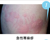 急性荨麻疹:起病比较急,皮损常突然发生,为局限性红色大小不等的风团,觉得剧烈瘙痒、灼热感。部位不定,可泛发全身或局限于某部。