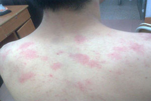 1、荨麻疹:荨麻疹是一种常见的过敏性皮肤病,在接触过敏原的时候,会在身体不特定的部位,冒出一块块形状、大小不一的红色斑块,这些产生斑块的部位,会发生发痒的情形,如果没有停止接触过敏原并加以治疗,出疹发痒的情形就会加剧.