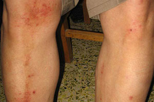 4、湿疹:湿疹为一过敏性疾病,属IV型变态反应。湿疹的原因和诱发的因素常因个体因素和疾病的不同阶段而异,因此不易确定。临床上以瘙痒显著,对称性分布,急性以丘疱疹为主,有渗出倾向,慢性常以苔藓样改变为主及反复发作、易成慢性为其特征。