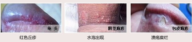 男性症状:男性性病生殖器疱疹的潜伏期2~7 天,原发损害是1个或多个小而瘙痒的红丘疹,迅速变成小水疱,3~5天后可形成脓疱,破溃后形成糜烂、溃疡、结痂,伴有疼痛。皮损单发或融合,男性好发于龟头、冠状沟、阴茎体或尿道口,常伴有发热、头痛、乏力、肌痛、腹股沟淋巴结肿大和压痛。症状持续1~2周,一般3~4周皮损结痂、愈合,再以同样的过程出现在另一个部位。