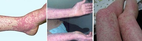 1、皮肤症状:以下肢大关节附近及臀部分批出现对称分布、大小不等的斑丘疹样紫癜为主,紫癜可突出皮面、伴轻微痒感,初为鲜红色,继而为暗红色、褐色。