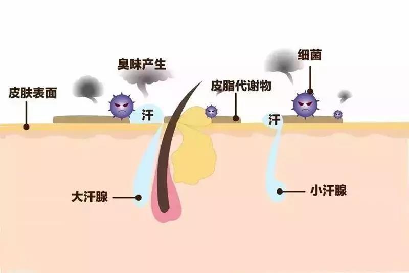 形成腋臭的主要是因为分布于腋下皮肤真皮层,开口于毛根部的顶浆汗腺(又名大汗腺),会分泌较浓稠的液体(主要为油脂、蛋白质、淀粉),经腋下上的细菌分解分泌从而形成的恶臭味的短链脂肪酸和氨。大蒜、砷剂通过小汗腺排泄也易形成臭味。除了汗腺分泌,遗传、生理、个人生活习惯都可以形成腋臭。